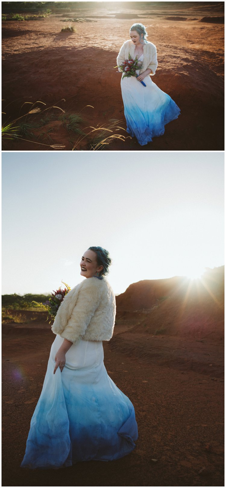 Courtney & Tom tied the knot in the gardens of Tom’s family beach cottage overlooking the Indian Ocean in Port Edward. When I asked them what was important to them and what they hoped my photos would capture they simply said ‘their community’. Their friends and family were the most significant part of the day and saying their vows surrounded by these people were what mattered. I was free to sit back and people watch. The decor was simple, some bunting, origami birds and shweshwe picnic blankets with a few pillows for their picnic style wedding. For the creative shoot we went up the road to the smallest desert in the world…The Red Desert. When Courts and Tom told me that that is where they would like go for their creative shoot I knew we were a match made in heaven. The colours chosen were complimented perfectly by the red sand, and the light just added to the magical experience. The reception had a chilled vibe as friends and family had turns to perform in an open mic style affair. This laid back wedding that didn’t conform to the normal traditions was just perfect for these two souls and they couldn’t have looked more in love or more perfect for one another.